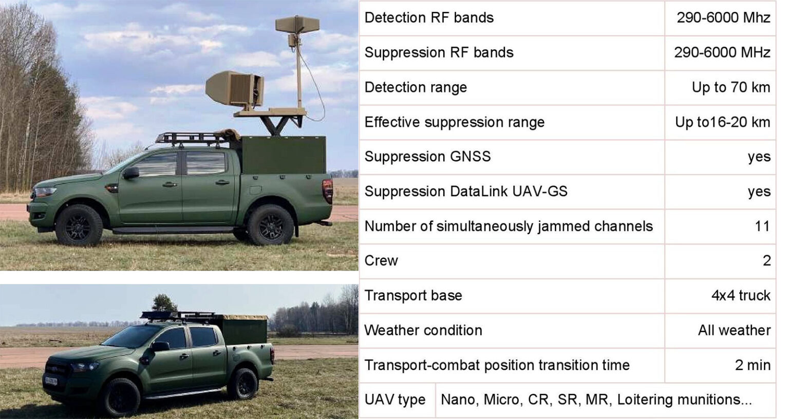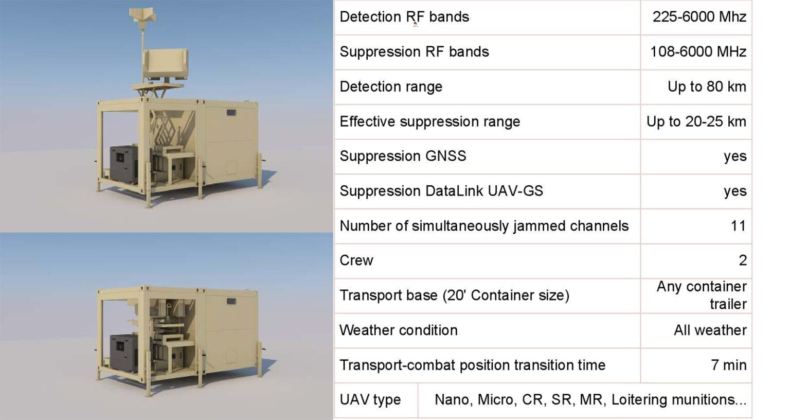 An effective electronic warfare system to counter a wide range of UAV types. It has real combat experience with several hundred successful results. Each technical solution of the system is the result of the accumulated experience while in warfare with a high-tech enemy. The system has high mobility, a set of tasks performed from detecting, tracking targets to suppressing satellite navigation channels and communication channels between UAV and GCS.